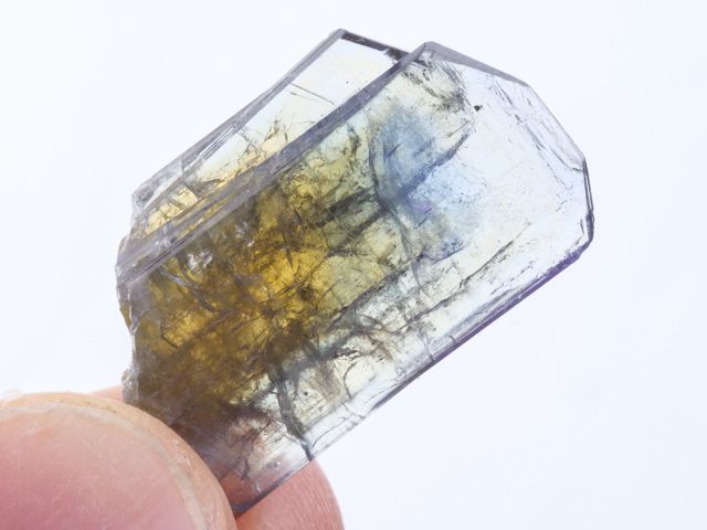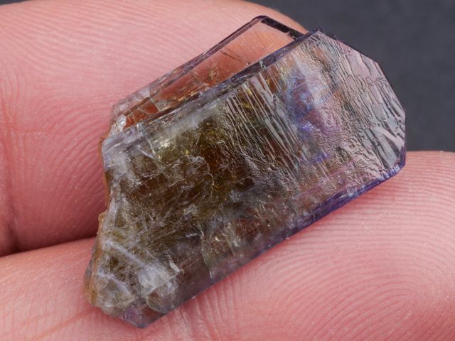 Lustrous terminated tanzanite crystal. The crystal is terminated, highly lustrous, internally transparent. Shows color change when viewed from front (blue-gray) and side (violet). Old find. No damage.