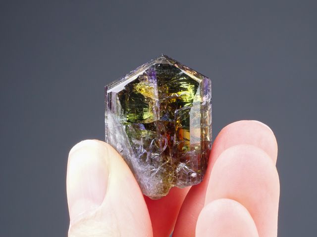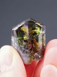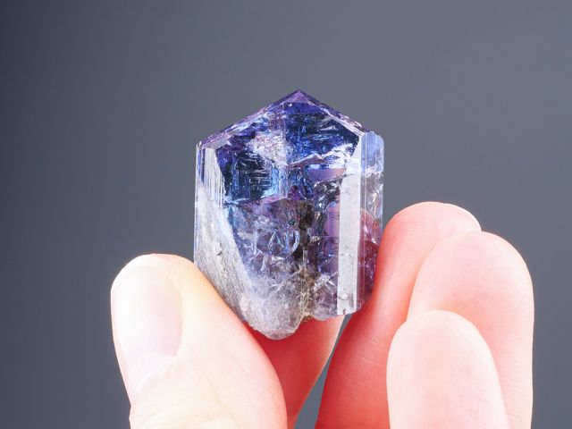 Lustrous crystal of blue-violet tanzanite from Merelani. The crystal is terminated, highly lustrous, internally transparent. Shows color change when viewed from front (blue-gray) and side (violet). Crystal is in good shape. No damage.