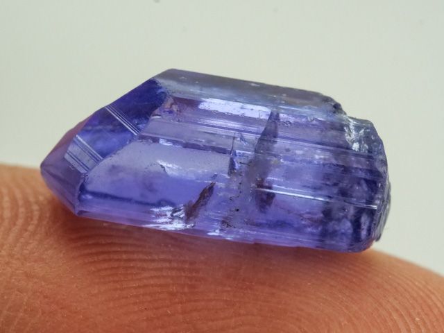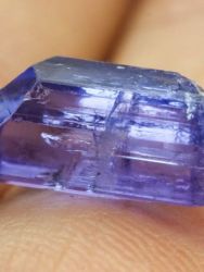 Lustrous tanzanite crystal of blue-violet tanzanite with no matrix attached. The crystal is terminated, highly lustrous, internally transparent. Shows color change when viewed from front (blue-gray) and side (violet). No damage. New find 5/2022.