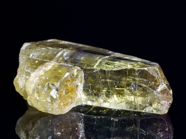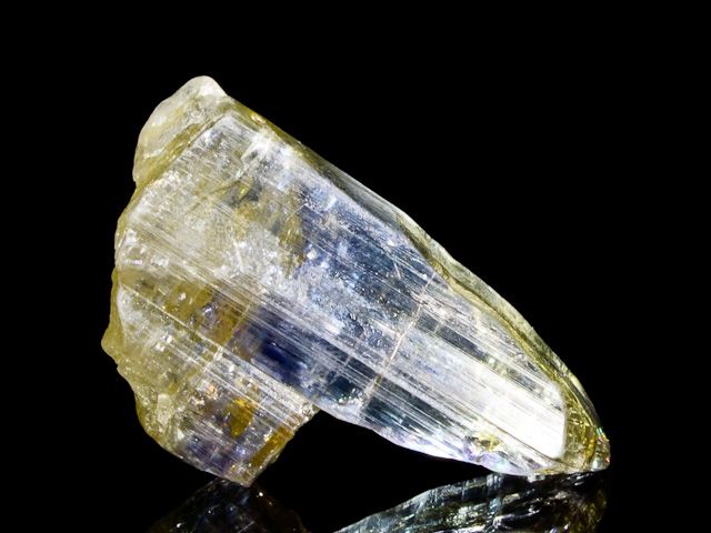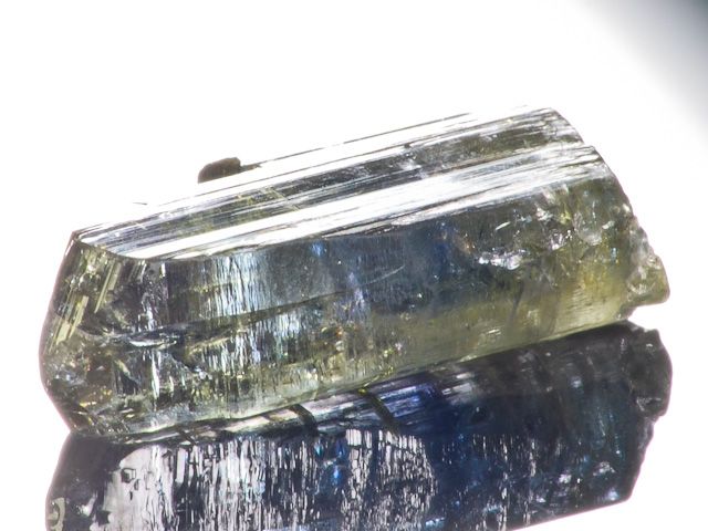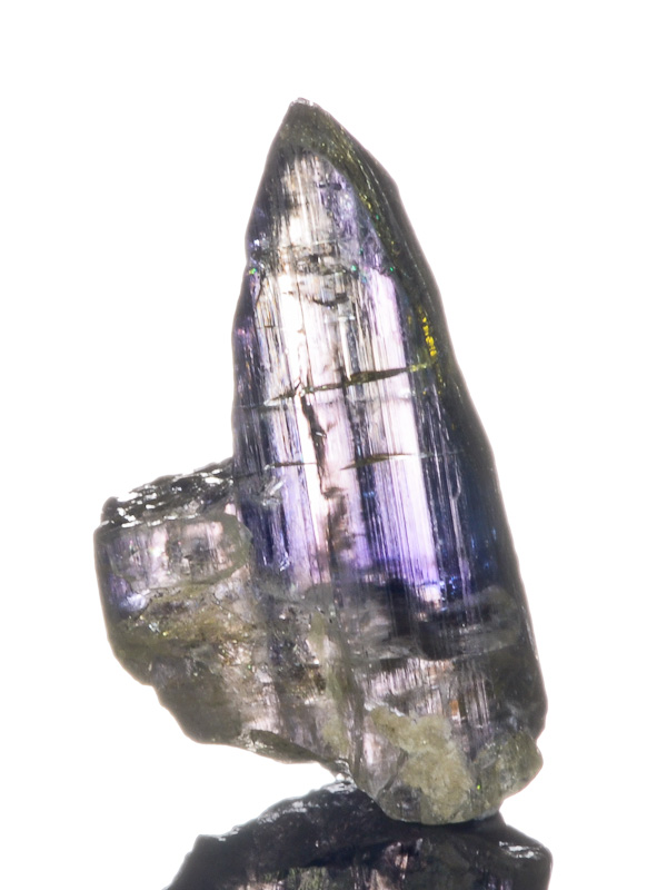 Lustrous tanzanite crystal of blue-violet tanzanite with no matrix attached. The crystal is terminated, highly lustrous, internally transparent. Shows color change when viewed from front (blue-gray) and side (violet).