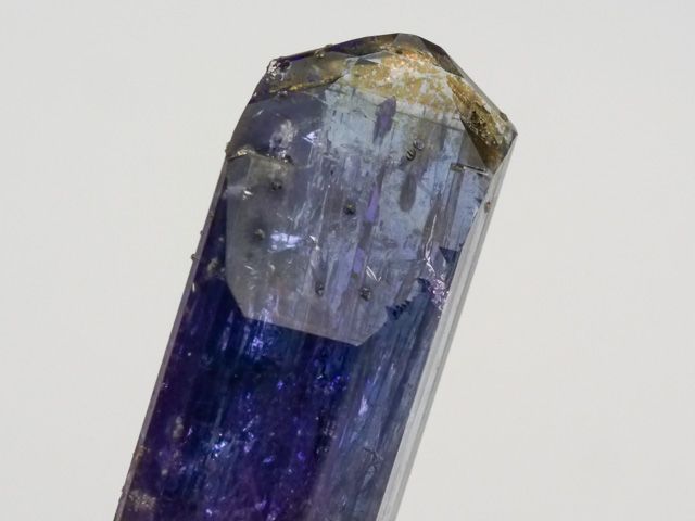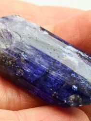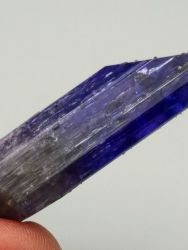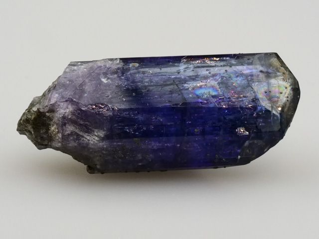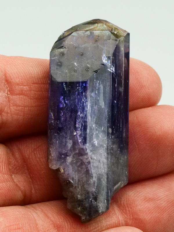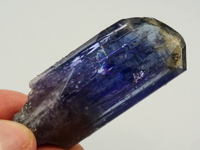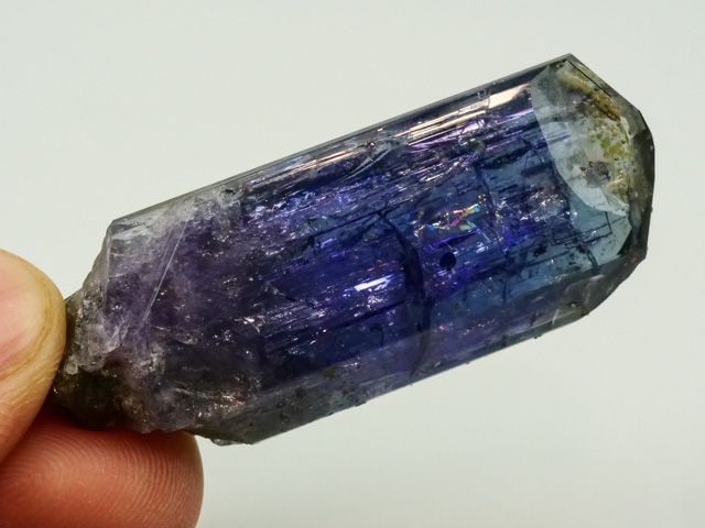 Lustrous tanzanite crystal of blue-violet tanzanite with no matrix attached. The crystal is terminated, highly lustrous, internally transparent. Shows color change when viewed from front (blue-gray) and side (violet). No damage. New find 10/2021.