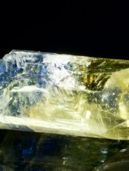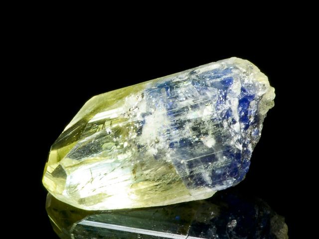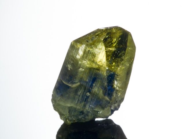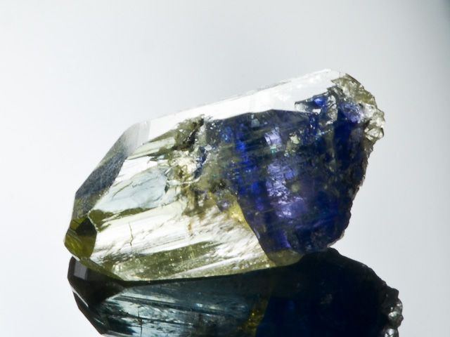 Lustrous tanzanite crystal of blue-violet-yellow tanzanite with no matrix attached. The crystal is terminated, highly lustrous, internally transparent.