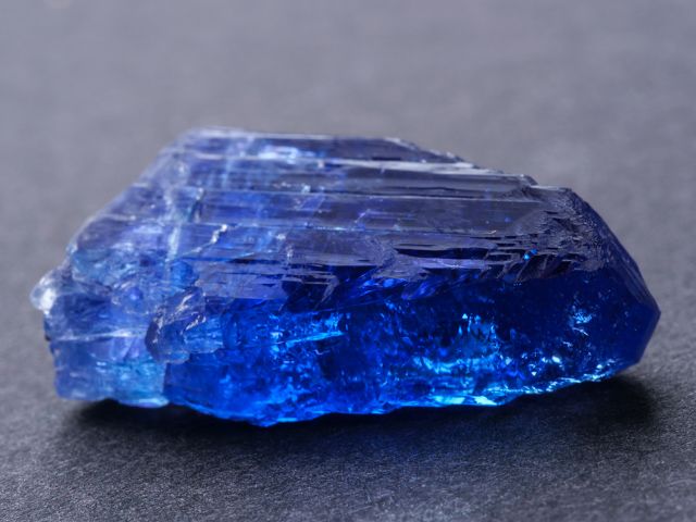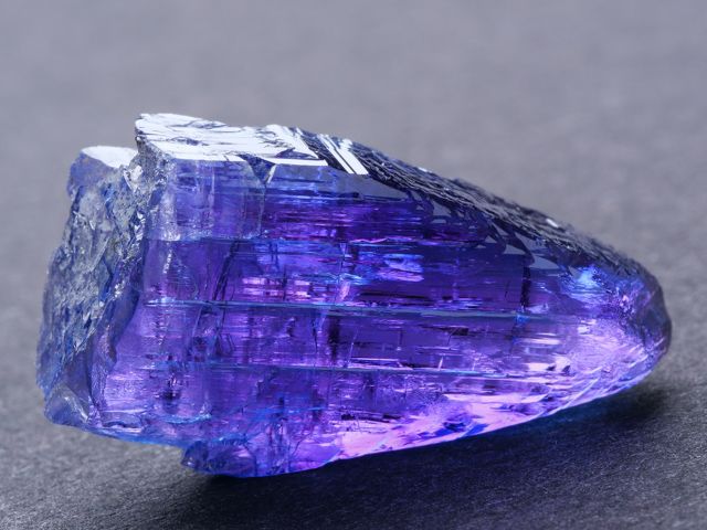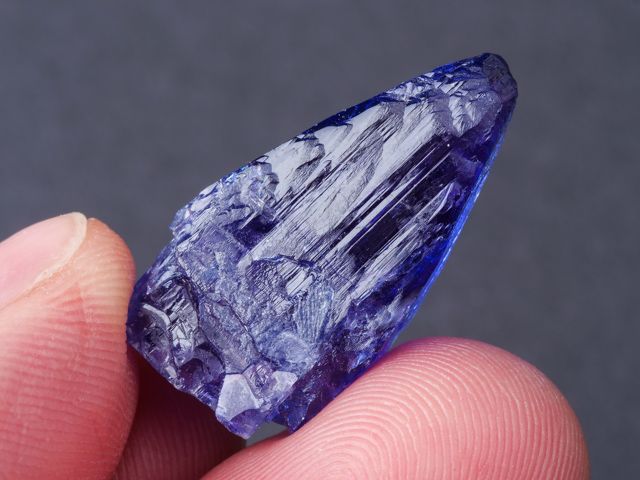 Lustrous tanzanite crystal of blue-violet tanzanite with no matrix attached. The crystal is terminated, highly lustrous, internally transparent. Shows color change when viewed from front (blue-gray) and side (violet). No damage. New find 2/2023.