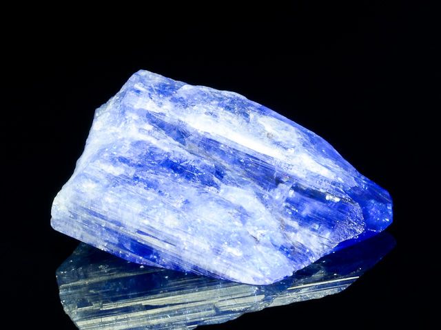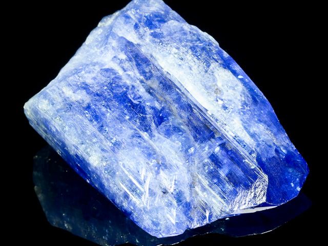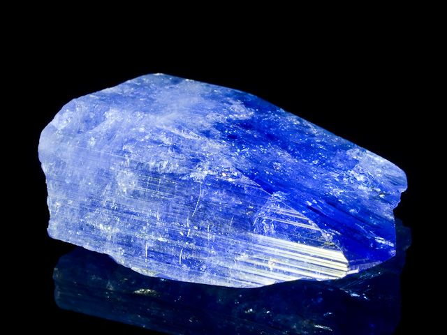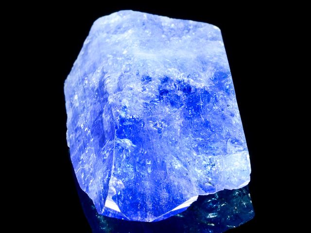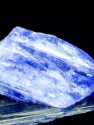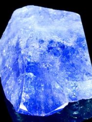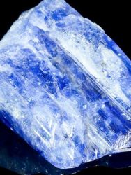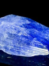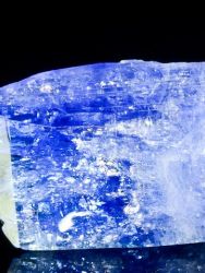 Velký lesklý krystal tanzanitu z lokality Merelani v Tanzánii. Krystal je ukončený a v dobrém stavu. Zadní nepohledová strana byla částečně kontaktní a není vyvinuta dokonale jako přední pohledová strana. Krystaly této kvality jsou z této lokality ceněny i pro jejich barvoměnu - z čelní strany jsou krásně šedomodré, zatímco z boční strany jsou fialkově fialové.