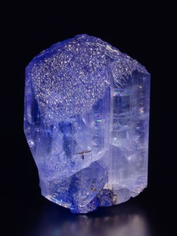 Lustrous terminated tanzanite crystal. The crystal is terminated, highly lustrous, internally transparent. Shows color change when viewed from front (blue-gray) and side (violet). No damage.