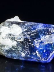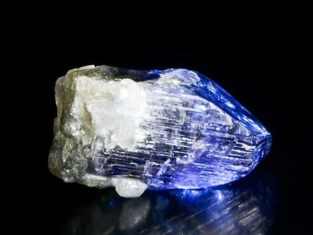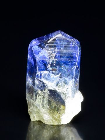 Lustrous tanzanite crystal of blue-violet tanzanite with no matrix attached. The crystal is terminated, highly lustrous, internally transparent. Shows color change when viewed from front (blue-gray) and side (violet). No damage.
