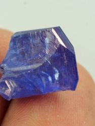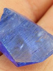 Lustrous terminated tanzanite crystal. The crystal is terminated, highly lustrous, internally transparent. Shows color change when viewed from front (blue-gray) and side (violet). New find. No damage.