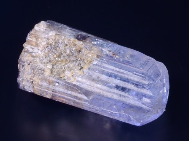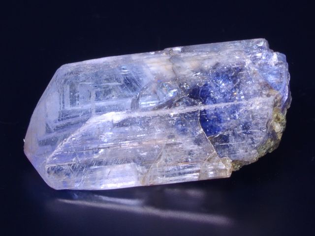 Lustrous terminated tanzanite crystal. The crystal is terminated, highly lustrous, internally transparent. Shows color change when viewed from front (blue-gray) and side (violet). No damage.