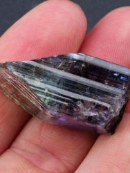 Exkluzivní lesklý krystal tanzanitu z lokality Merelani v Tanzánii. Krystal je ukončený, zajímavě zonální (horní část je světle žlutá, ve spodní části krystalu je tmavě modrá partie). Barevné odstíny odvisí od způsobu a především zdroje nasvícení. V případě, že použijete polarizované světlo mění se barvy od modré přes fialovomodrou až po žlutou - podle směru zdroje světa. Na denním světle kámen nemá barevné tóny jako na fotografiích.