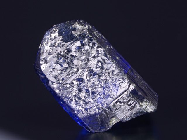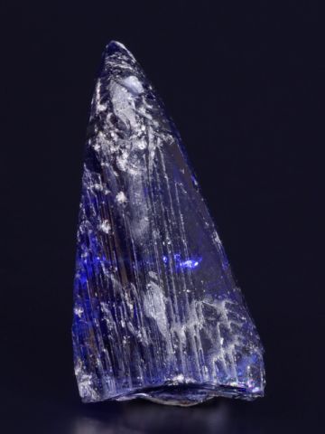 Lustrous tanzanite crystal of blue-violet tanzanite with no matrix attached. New find 10/2021.Lustrous tanzanite crystal of blue-violet tanzanite with no matrix attached. The crystal is terminated, highly lustrous, internally transparent. Shows color change when viewed from front (blue-gray) and side (violet). No damage. New find 10/2021.