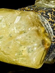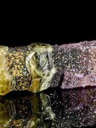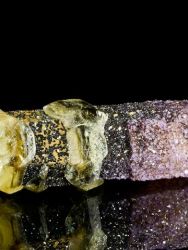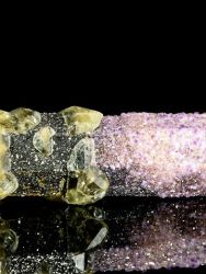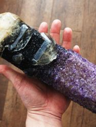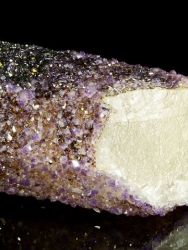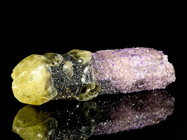 This is a very striking specimen of a nail head calcite coated with amethyst and yellow calcite from Artigas, Uruguay.This is a very striking specimen of a nail head calcite coated with amethyst and yellow calcite from Artigas, Uruguay. A stunning single, sharp, pristine calcite sample coated with amethyst. The contrast is striking. Both are common minerals, but the association and stark display qualities of this hand-sized piece make it stand out from the crowd. I thought it was, frankly, one of the best Uruguayan calcites/amethyst I have yet seen and kept it. No damage. Set on its custom display base, it is a very impressive piece, and literally radiates color in a case.