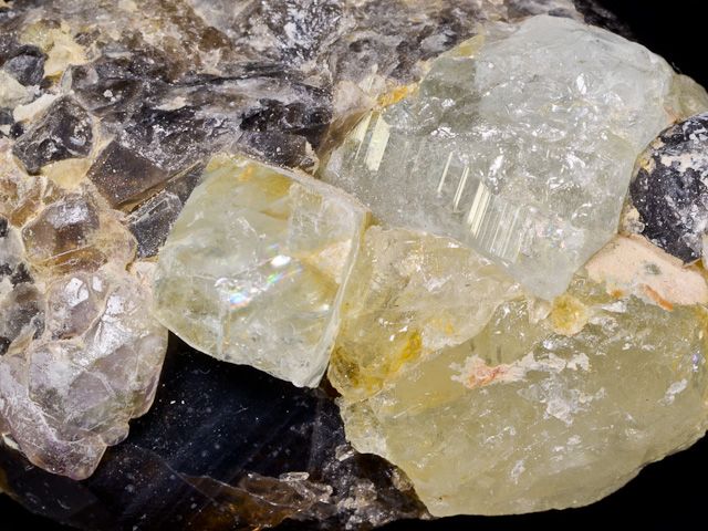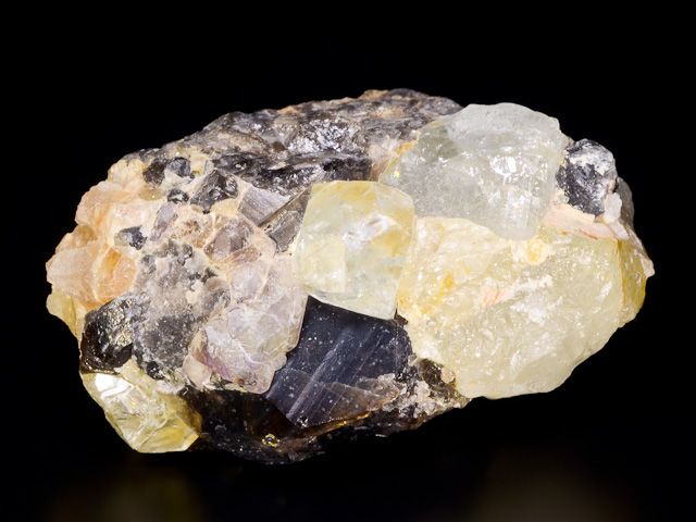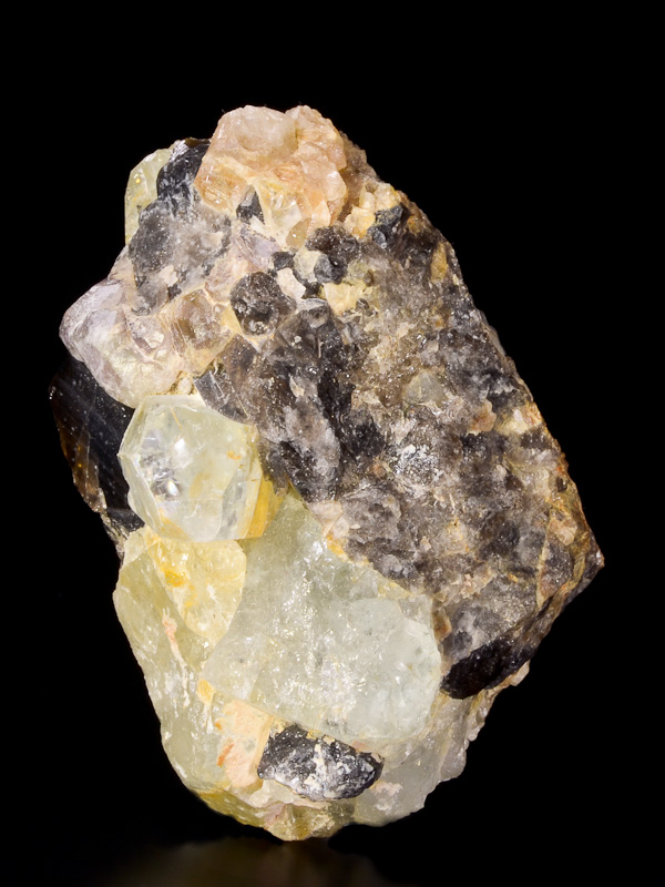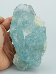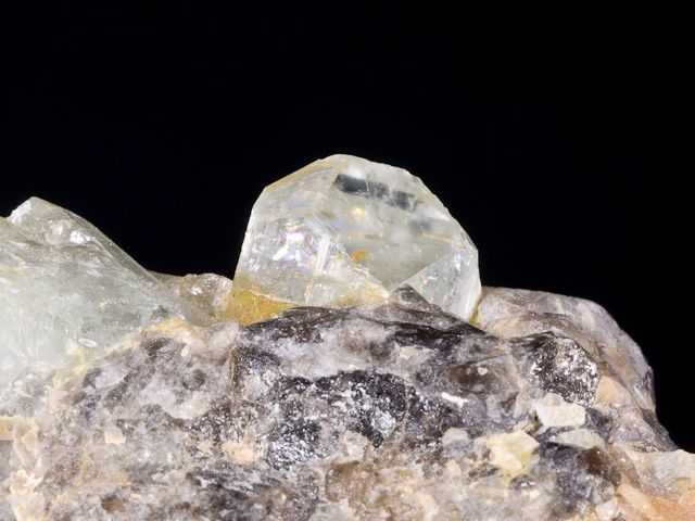 Light blue gem crystal of topaz (15 mm) on a quartz and fluorite matrix.Light blue gem crystal of topaz (15 mm) on a quartz and fluorite matrix. Topaz crystals are attached to a matrix of smoky quartz and 1 fluorite crystal. The composition of topaz against slightly duller dark quartz is really good. Transparent colorless topaz crystals on the side of matrix! Main topaz is chipped. Interesting material from Russia.