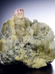 Gem pink topaz matrix specimens are generally considered to be the rarest and most desirable of all mineral species from Pakistan. This is an outstanding and rare small cabinet from Katlang. A 2.2 cm, light pink, terminated gem crystal set with the calcite on dark matrix. This amazing piece is from the small deposit at Katlang, which has produced the only topazes of such color from the Himalayas. Aesthetic specimens of this size and quality are extremely rare!