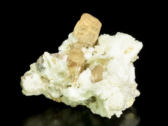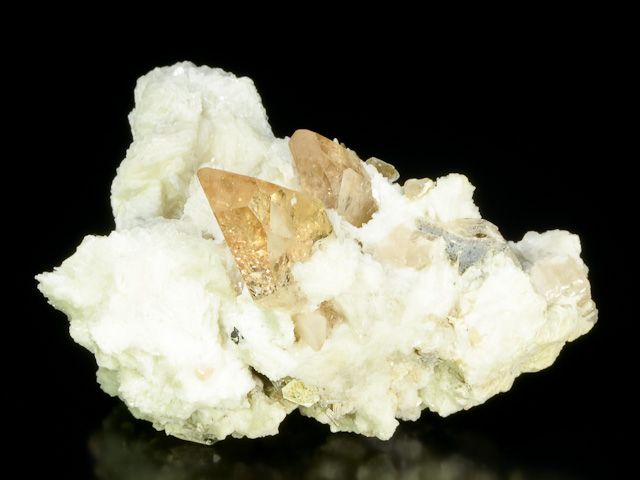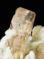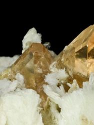Skupina 4 krystalů ukončených topazů na velice estetické podložce.Skupina 4 krystalů ukončených topazů na velice estetické podložce. Barva topazu je přechodem čiré růžové a jemně oranžové. Tento typ topazu je označován "rauch" či "sherry". Největší krystal topazu měří 3,7 cm. Podložku tvoří krystaly sněhobílého živce, lesklých lupenů muskovitu a křemene.