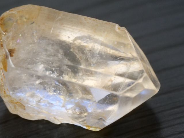 This limpid and light topaz crystal is almost gemmy. It is face centered and clearly exhibits its perfect basal cleavage where it was removed from its matrix at bottom. It has beautiful inclusion of fluorite?!