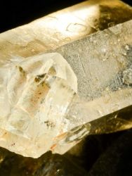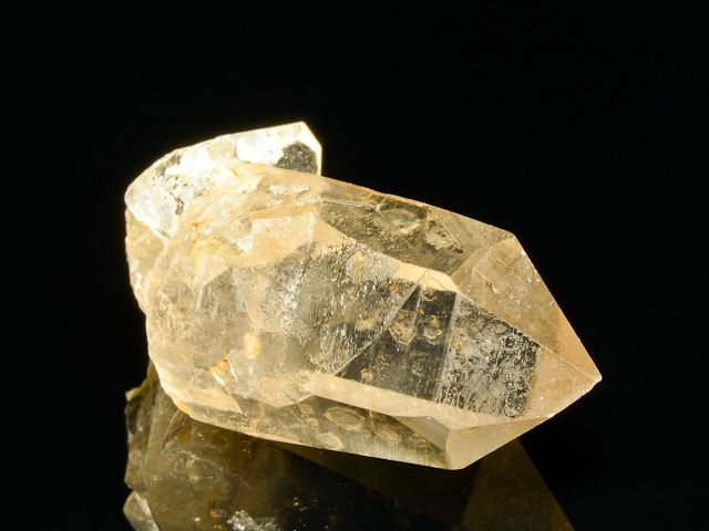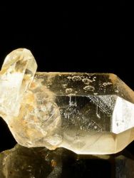 Terminated quartz crystal with an attached, terminated topaz crystal from Momeik.Terminated quartz crystal with an attached, terminated topaz crystal from Momeik. Undamaged quartz crystal that is totally transparent with alternating lightly frosted luster faces and highly lustrous faces.