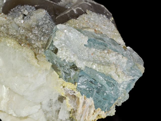 Exkluzivní vzorek ukončeného krystalu světle modrého topazu na krystalu záhnědy.Exkluzivní vzorek ukončeného krystalu světle modrého topazu na krystalu záhnědy. Krystal topazu měří napříč 4.6 cm, je velice lesklý a čistý se světle modrou barvou. Krystal je z poloviny kostrovitě rostlý s částečně leptanými hranami. Nepohledová stránka je nárůstová. Část vzorku je tvořena krystaly sněhobílého albitu, které jsou pokryty slídou. Kamenů jako je tento je opravdu minimum - kvalitní barevné topazy na podložce jsou světově velmi ceněné.