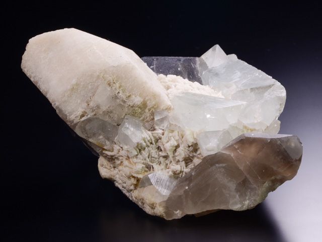 Velký krystal ukončeného živce společně s modrými topazy a záhnědami na velice estetické podložce.Velký krystal ukončeného živce společně s modrými topazy a záhnědami na velice estetické podložce. Podložku tvoří živec a křemen. Skvělý vzorek do sbírky.
