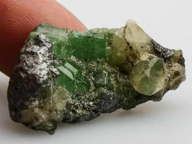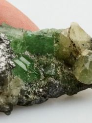 Nice group of Tsavorite crystal, glossy and well distributed on some Diopside crystals up to 10 mm.Nice group of Tsavorite crystal, glossy and well distributed on some Diopside crystals up to 10 mm. The matrix is formed by Graphite in little foliaceous crystals.