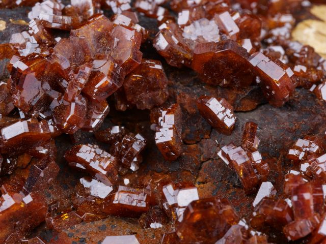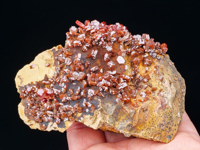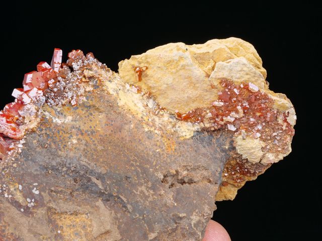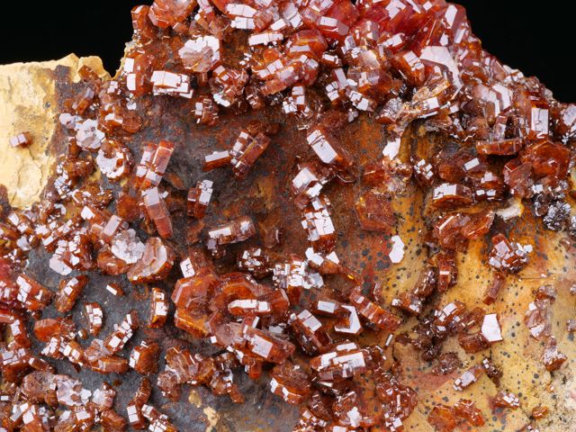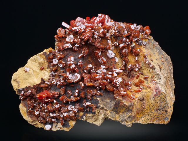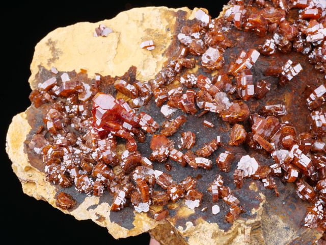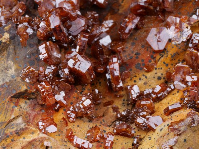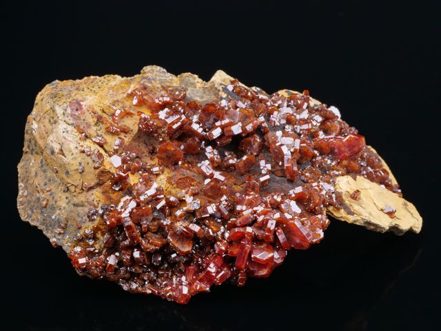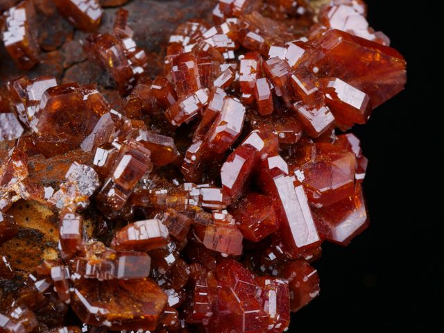Vanadinit tvoří sytě červené, skelně až diamantově lesklé, částečně průsvitné, pěkně ohraničené, hexagonální krystaly dosahující velikosti až 8 mm.Vanadinit tvoří sytě červené, skelně až diamantově lesklé, částečně průsvitné, pěkně ohraničené, hexagonální krystaly dosahující velikosti až 8 mm. Super vzorek do sbírky!