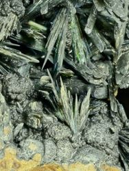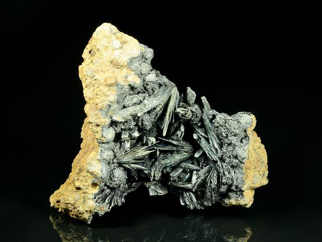 Sprays of dark, lustrous vivianite are spread across a limonite matrix. The vivianite crystals measures to 2.5 cm wide. The locality is Kerchenskoe deposit, Kerchenskyi (Fe)-ore basin, Kerch Peninsula, Crimea Peninsula, Crimea Oblast', Ukraine. No damage.