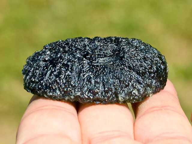 Velmi krásný vltavín v opravdu povedeném tvaru půldisku. Vltavín má výrazně zelenou barvu a typickou výrazně ježatou lesklou skulptaci. Vltavín má několik velmi drobných setření z vrstvy. Nejedná se o žádné velké poškození - největší 2x2 mm. Cena odpovídá stavu. Kámen vhodný do kvalitní sbírky.