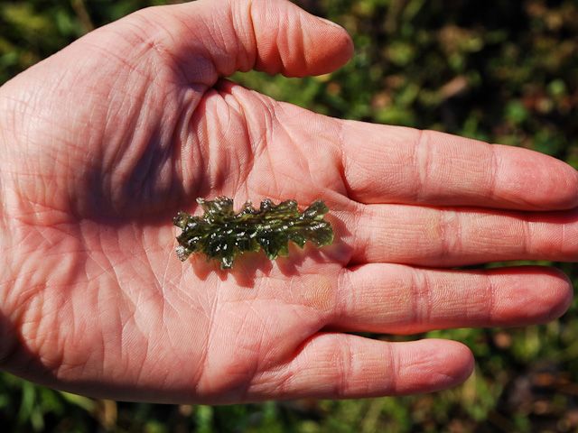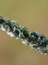 Krásný vltavín ježaté skulptace ve tvaru kapky. Vltavíny v obdobném tvaru kapky se dochovají v neporušené formě jen opravdu velmi vzácně. Vltavín má sytě zelenou barvu a až netypickou extra výrazně ježatou skulptaci. Kámen vhodný do té nejlepší sbírky. Jen cca 2 velmi málo viditelné setřelé jehlice - zohledněno v ceně.