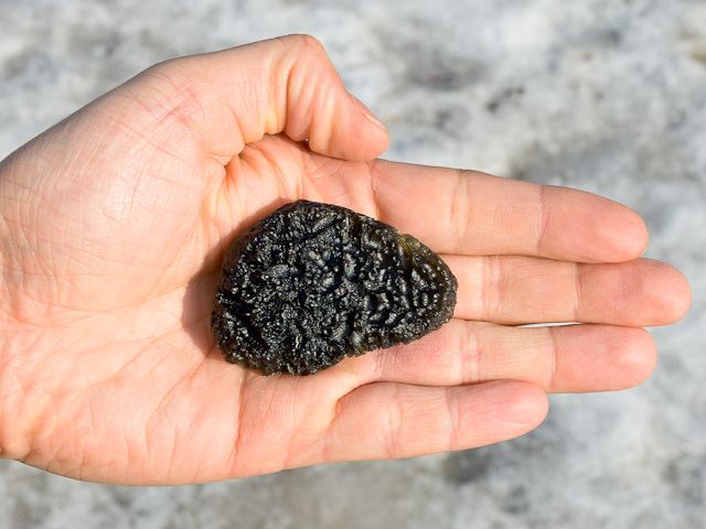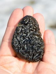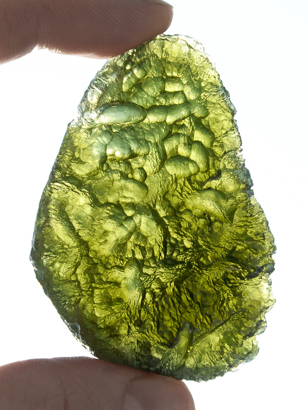 Krásný nepoškozený vltavín kapkovitého tvaru. Vltavín má výraznou zeleno hnědou barvu a velmi hrubou skulptaci. Tvarem i kvalitou je kámen předurčen do kvalitní sbírky.