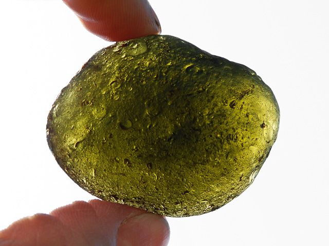 Moravský vltavín tmavě zelené barvy z lokality Slavětice. Kámen je matnější a v dobrém stavu - pouze jedna velmi jemná oděrka od polního přesunu (2x1,5 mm). Výskyt moravských vltavínů je vzácnější než jak tomu je na jihu Čech. Moravské vltavíny jsou navíc mírně odlišné jak svojí skulptací tak barvou.