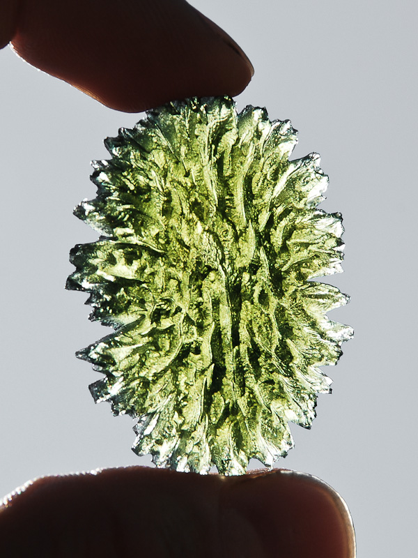 Vltavín výrazně rozježené skulptace a nadprůměrné váhy na lokalitu. Kámen je ve vynikajícím stavu s krásnými dlouhými jehlicemi. Navíc je vltavín zajímavý tím, že se jedná o pravidelný celotvar. Na kameni lze najít při podrobném prohledání několik velmi drobných setření bočních jehlic. Kameny nad 5 gramů obdobné kvality jsou zcela raritní a vysoce ceněny nejen v zahraničí, ale především u nás v ČR. Vzhledem k situaci dané lokality se jedná jednoznačně o investiční vzorek.