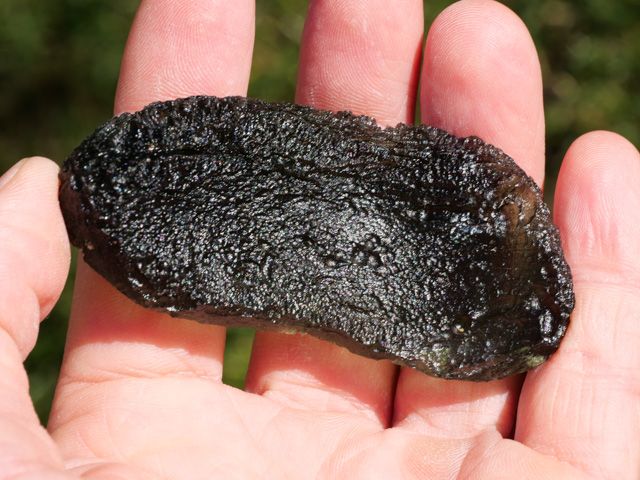 40.05 g real rare natural tektite - moldavite. This is a nice moldavite in the amazing shape. This stone is dark-coloured as you can see in the picture. A magical natural moldavite from Czech Republic with a fascinating shape. This specimen has been hand selected for high quality.