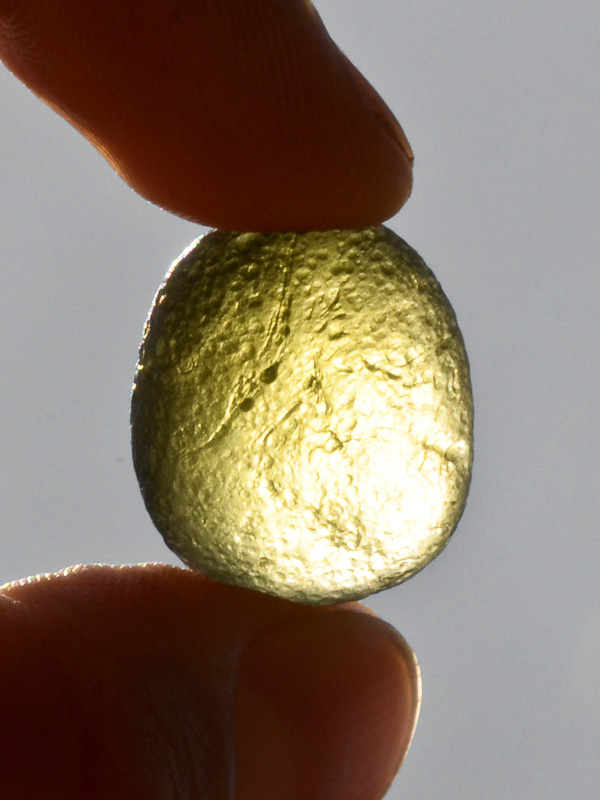 Lusatian 4.75 g Moldavite from most famous location Ottendorf Okrilla.Lusatian Moldavite from most famous location Ottendorf Okrilla. German 4.75 g no damage extra rare moldavite! Textbook perfect oval shape – typical surface. Simply perfect medium sized gem in excellent proportions and typical "Ottendorf“ fancy and unusual surface sculputring. German Moldavite is rarest of all Moldavites (together with moravian stones).