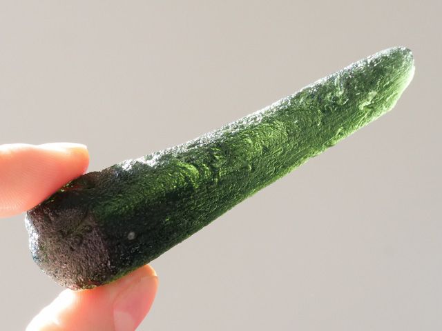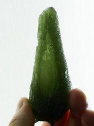 58.5 g real rare natural tektite - moldavite. Simply perfect XXL sized gem in excellent proportions and typical „Zatáčka“ fancy and unusual surface sculputring. Moldavites with primary shape are very rare among moldavites, representing less than 1% of all pieces. A magical natural moldavite from Czech Republic with a unbelievable large bubble (62 mm) inside. Probably the biggest bubble in the Moldavite on the world.