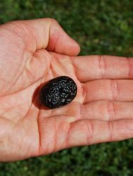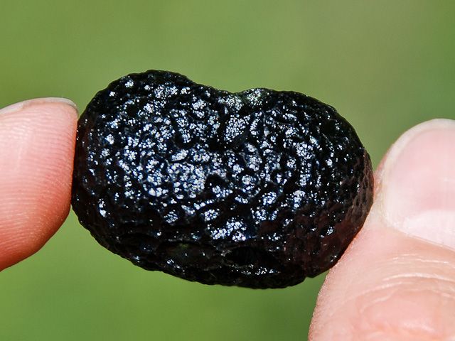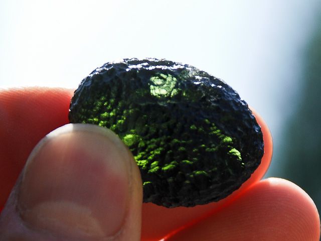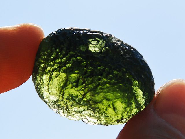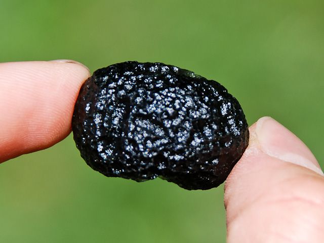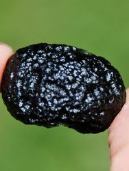 Sbírkový vltavínu "rozinkového" tvaru a ve vynikajícím stavu. Kámen je zajímavý nejen příjemnou výrazně zelenou barvou, vysokým leskem, zajímavou skulptací, ale také 4 mm velkou, hezky viditelnou bublinou uvnitř kamene. Nepoškozený kámen v základním okrouhlém tvaru.