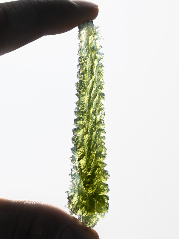 Vltavín výrazně rozježené skulptace ve tvaru protažené kapky. Kámen je v dobrém stavu - pouze 3 stěží viditelné setření hran jehlic. Navíc je vltavín zajímavý tím, že se jedná o celotvar. Takto tvarované kameny z této lokality jsou zcela raritní a vysoce ceněny nejen v zahraničí, ale především u nás v ČR. Vzhledem k situaci dané lokality se jedná jednoznačně o investiční vzorek.
