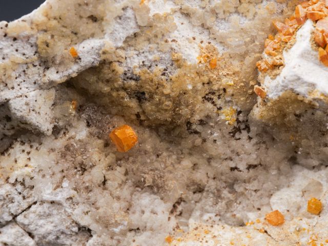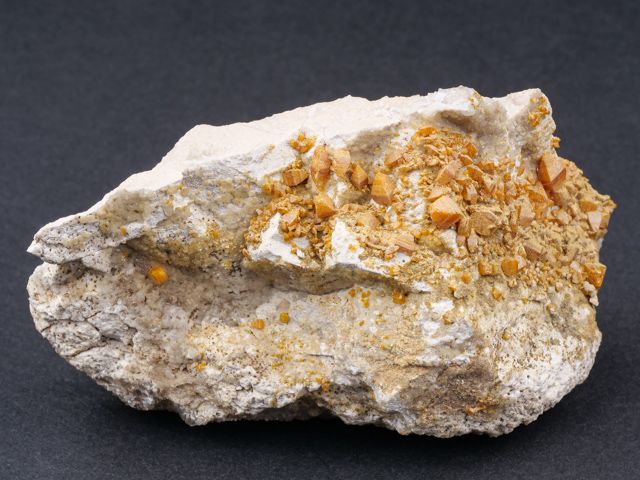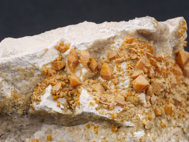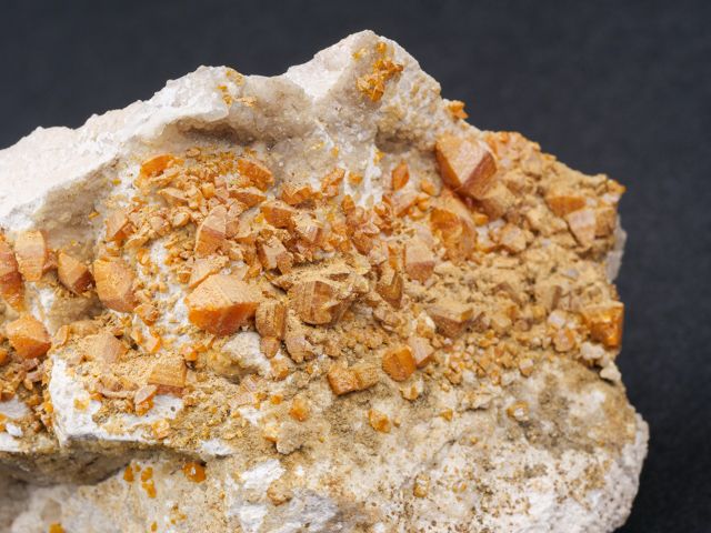 Oranžové, skelně lesklé, tabulkovité krystaly wulfenitu, které dosahují velikosti až 7 mm pokrývají podložku převážně z pohledové strany.Oranžové, skelně lesklé, tabulkovité krystaly wulfenitu, které dosahují velikosti až 7 mm pokrývají podložku převážně z pohledové strany. Zajímavý cenově dostupný vzorek.