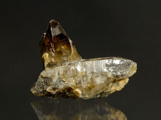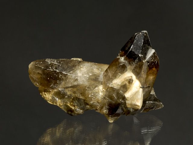 V-shaped cluster of intersecting doubly-terminated smoky quartz crystals from Pikarec.V-shaped cluster of intersecting doubly-terminated smoky quartz crystals from Pikarec. The smoky quartz crystals are lustrous, internally transparent, with deepest color at the terminations. The termination of the crystal is chipped.