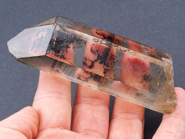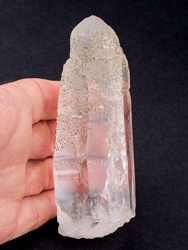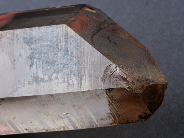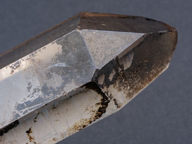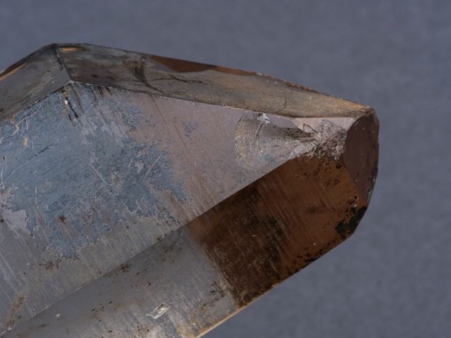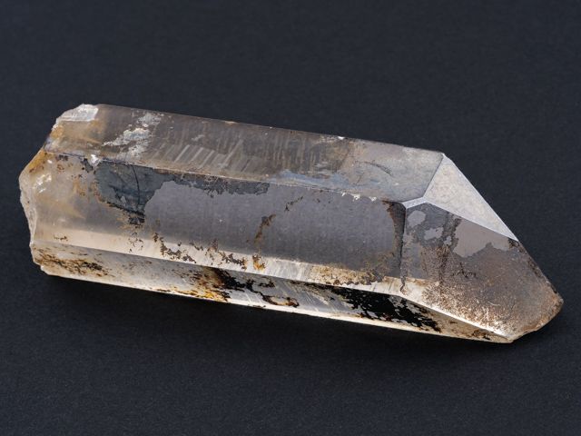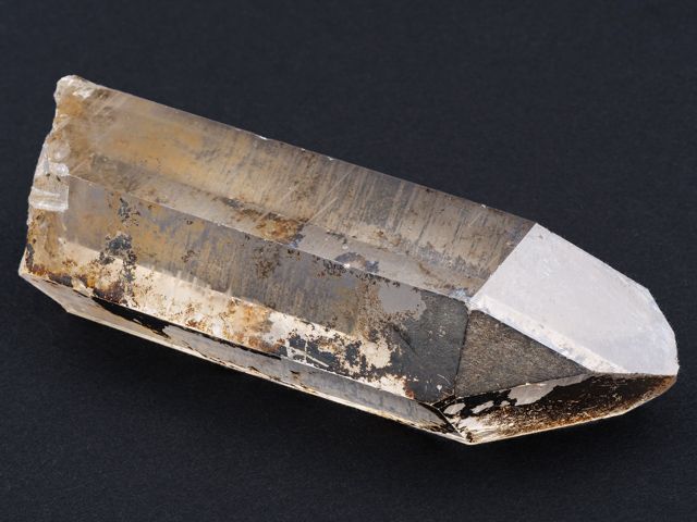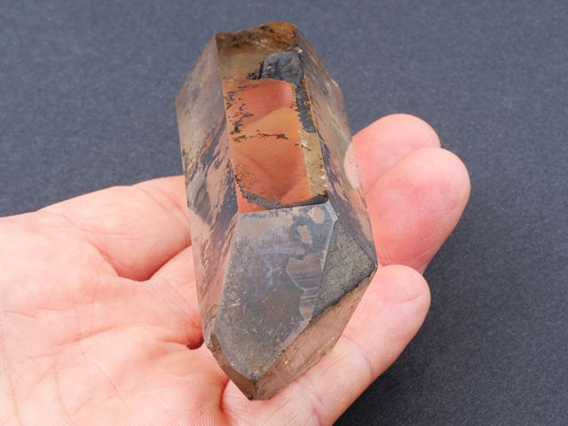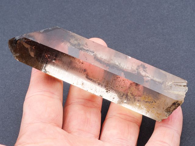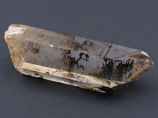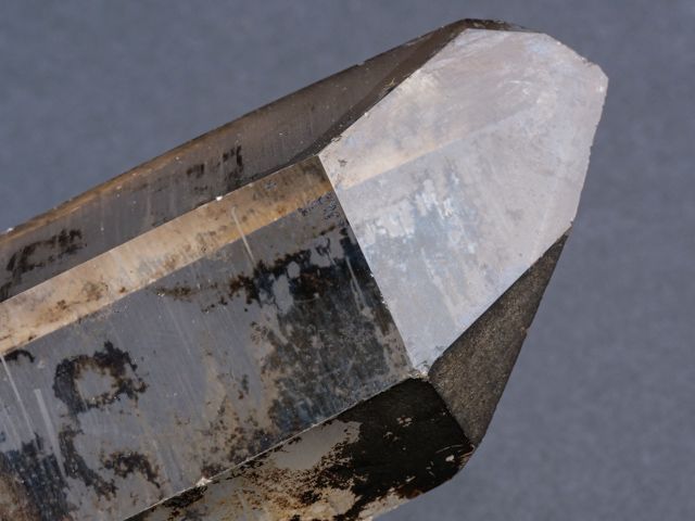 Zajímavý krystal přírodní záhnědy z ukrajinské lokality Volyň. Krystal je ukončený, lesklý a má přirozenou příjemně světle kouřovou barvu. Vysoká čistota dovoluje podobný materiál brousit - velké partie jsou drahokamové tzv. optický křemen - zde by to ale bylo velmi škoda jakkoliv s kamenem pracovat. Kámen má jen minimum velmi jemných poškození/oťuků - toto je zahrnuto do výsledné ceny. Toto jemné poškození neničí na první pohled dojem z nadstandardně efektního kamene.
