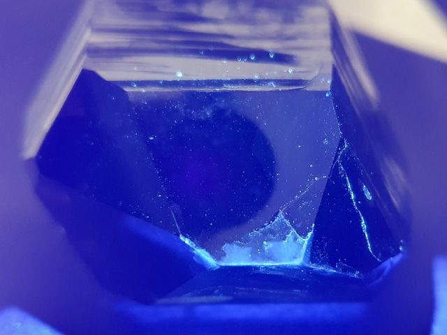 Krystal záhnědy z mongolské lokality Dzun Bayan. Krystal je lesklý a průsvitný až průhledný. Ukončení mělo drobné poškození, které bylo vzhledem ke kvalitě vzorku profesionálně opraveno. Oprava lze vidět na fotografii pořízené pod UV světlem. Velmi zajímavý kámen.