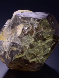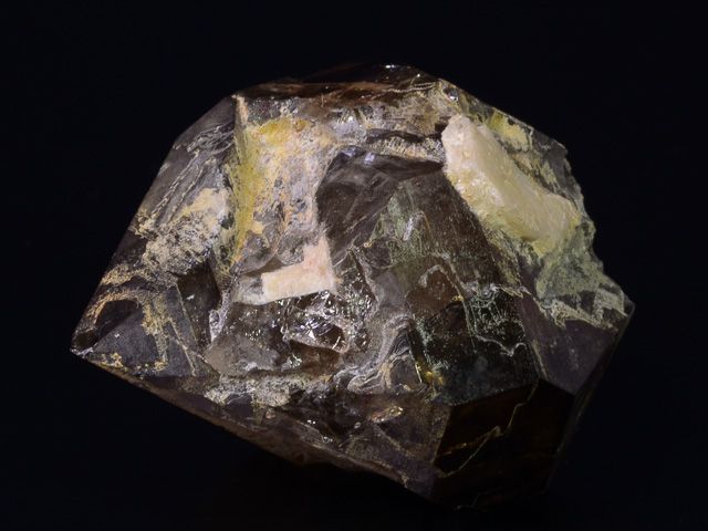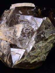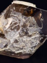 Doubly-terminated transparent medium-gray smoky quartz crystals with lustrous, slightly striated crystal faces. The terminations of the crystal are chipped. Collected ca. 1965. The crystal has 2 contact sites and 2 dings.