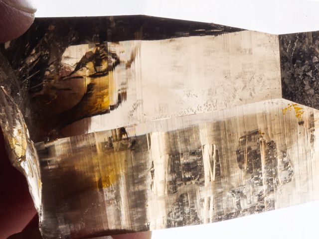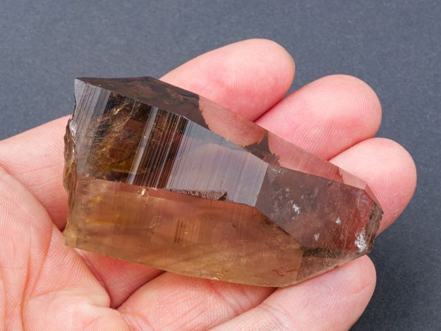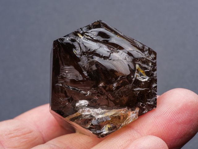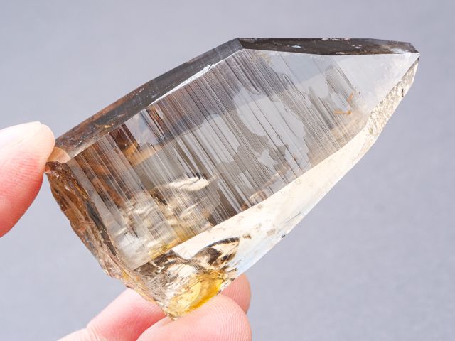 Zajímavý krystal přírodní záhnědy z ruské lokality Južnyj. Krystal je ukončený, lesklý a má přirozenou příjemně světle kouřovou barvu. Vysoká čistota dovoluje podobný materiál brousit - velká partie (99%) je drahokamová tzv. optický křemen - zde by to ale bylo velmi škoda jakkoliv s kamenem pracovat.