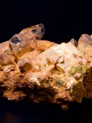 Ukázkový vzorek drúzy krystalů kouřově zbarveného křemene - záhnědy a světle žlutavého krystalu albitu.Ukázkový vzorek drúzy krystalů kouřově zbarveného křemene - záhnědy a světle žlutavého krystalu albitu. Krystaly záhnědy jsou potaženy jemnou vrstvou železitých oxidů. Na vzorku je i řada slíd. Pěkný sbírkový vzorek, byť s drobným poškozením. Na vzorku je i krystal skorylu, ale ten není ukončen.