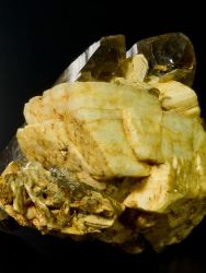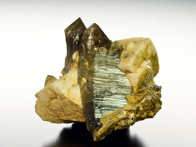 Ukázkový vzorek drúzy krystalů kouřově zbarveného křemene - záhnědy a světle žlutavých krystalů albitu.Ukázkový vzorek drúzy krystalů kouřově zbarveného křemene - záhnědy a světle žlutavých krystalů albitu. Krystaly záhnědy jsou lesklé, tmavě zbarvené a čisté. Na vzorku je i řada slíd. Pěkný sbírkový vzorek.