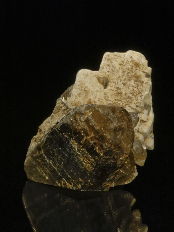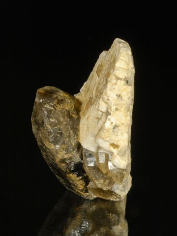 Nice crystal of dark intensely smoky quartz, to 6.0 cm in length.Nice crystal of dark intensely smoky quartz, to 6.0 cm in length, exhibit growth from a matrix of drusy white quartz and flesh colored feldspar crystals. The crystal is lustrous and partially gemmy and nearly pristine with only a tiny small ding on the back of the termination, on the back side. Otherwise complete and pristine all around. Very nice association on dramatic matrix.