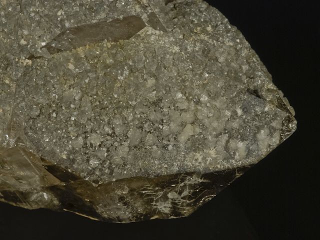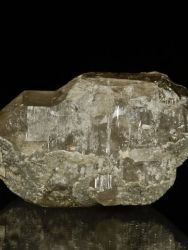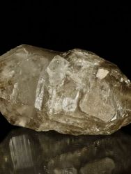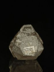 Doubly-terminated transparent medium-gray smoky quartz crystals with lustrous, slightly striated crystal faces.Doubly-terminated transparent medium-gray smoky quartz crystals with lustrous, slightly striated crystal faces. The terminations of the crystal are chipped. Collected ca. 1965. The crystal is draped with white dolomite on the top and back.