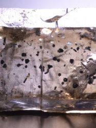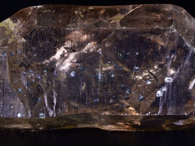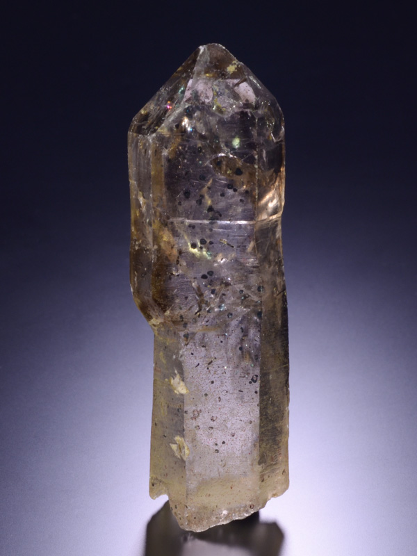Transparent smoky quartz crystal with grey hematite and dark dravite inclusions.Transparent smoky quartz crystal with grey hematite and dark dravite inclusions. The inclusions are oriented along crystal edges. Small parts of edges and terminations are chipped.