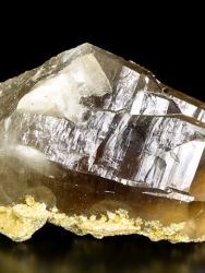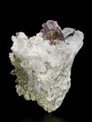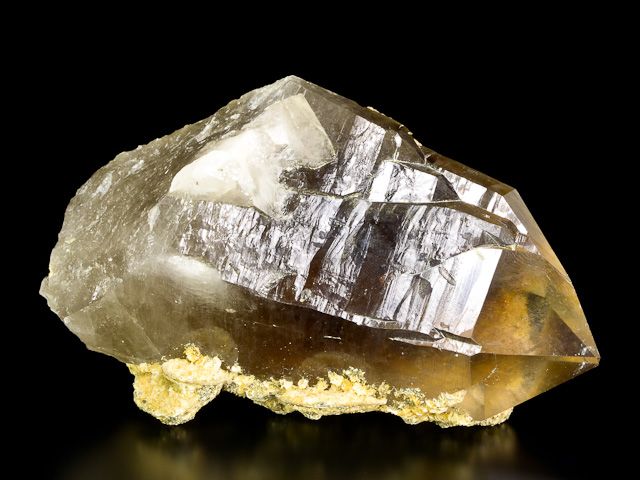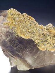 Velký krystal záhnědy pokrytý několika krystaly sideritu, fluoritu, druhou generací jemného sideritu a zlatavými krystaly neurčeného minerálu.Velký krystal záhnědy je pokrytý několika krystaly sideritu, jemně fialového fluoritu, druhou generací jemného sideritu a zlatavými krystaly neurčeného minerálu. Krystaly fluoritu mají bílofialovou barvu, jsou spíše matné. Největší krystal fluoritu dosahuje velikosti 7 mm. Ukončení krystalu křemene je velmi jemně v podstatě nepatrně setřené (tzv. čip). Zajímavostí je opravdu neurčený minerál v podobě zlatavých jehlic do velikosti 7 mm.