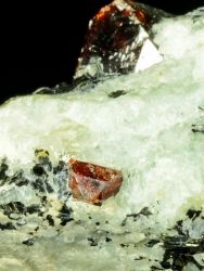 Two jewel-like, doubly terminated, glassy and gemmy, wine red, crystals of zircon, to 1.3 cm in length are emplaced majestically on top a matrix of quartz and biotite.Two jewel-like, doubly terminated, glassy and gemmy, wine red, crystals of zircon, to 1.3 cm in length are emplaced majestically on top a matrix of quartz and biotite. The upper sides are incomplete where the intersected adjacent crystals.