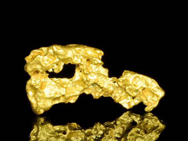 Vzorek zlata o váze slušných 2,18g z australské lokality Central Victoria Gold Field.Vzorek zlata o váze slušných 2,18g z australské lokality Central Victoria Gold Field. Tento luxusní zlatý vzorek má ještě částečně viditelné krystalové hrany, jež byly časem přírodně ohlazeny do nynější podoby. Nugget má v sobě jednu velkou díru, což je u obdobných vzorku velmi ceněno. Investiční vzorek z Austrálie.