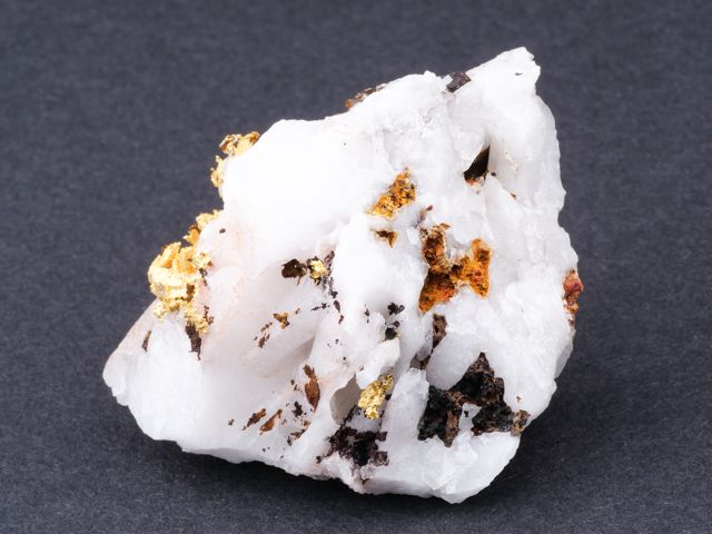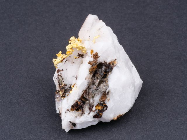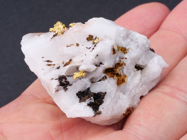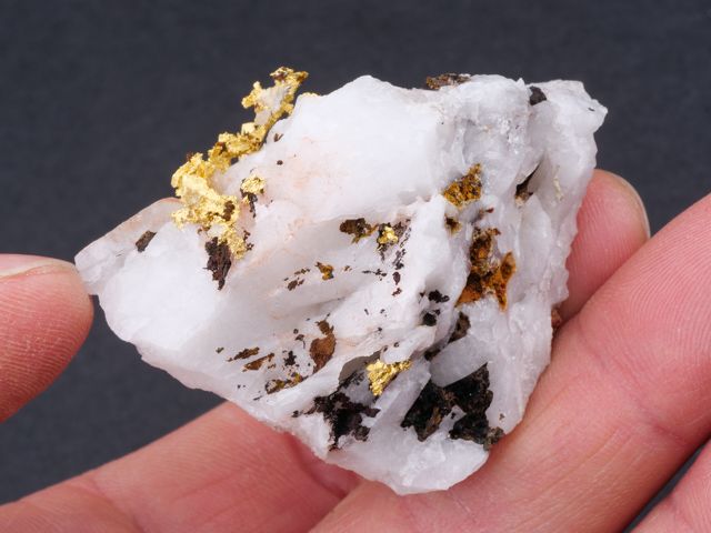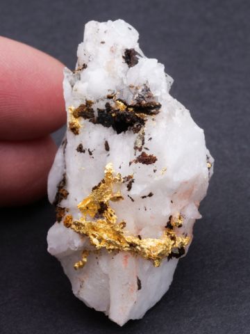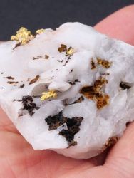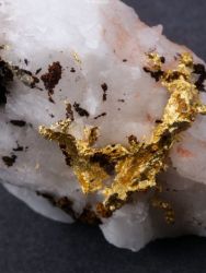 Native gold crystallized on quartz from the recent discovery in Morocco (first specimens revealed in late 2020).Native gold crystallized on quartz from the recent discovery in Morocco (first specimens revealed in late 2020). The main "feather" measures 2.0 cm.